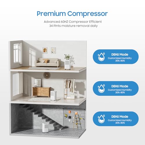2500 Sq.Ft Dehumidifiers for Home Basement with Drain Hose, 34 Pints Large Room Dehumidifier Portable with Smart Humidity Control, 3 Opeartion Modes for RV, Bathroom, Bedroom