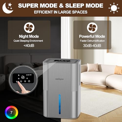 Aerbyon Dehumidifiers for Home 95 OZ Water Tank(1000 sq. ft) Dehumidifier for Bathroom with Auto Shut Off,7 Colors Light, Quiet Sleep Mode Dehumidifier for Bedroom, Basement, RV, Closet