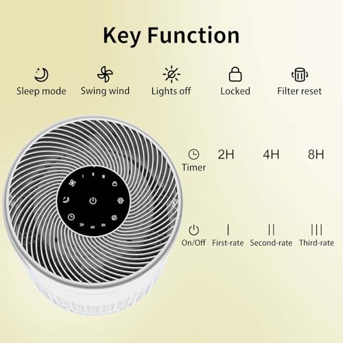Smart Features: The air purifier comes with a timer function (1H/2H/4H/8H), four fan speed settings (Sleep/Low/Med/High), and a child lock to prevent accidental changes, offering convenience and safety for homes with children and pets.