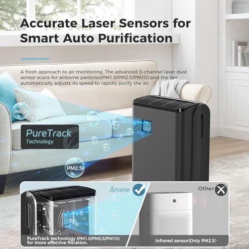 Impressed Purification: The AROEVE MK07 air purifier has a high CADR of 176 CFM / 300 m³/h, equipped with a large intake for efficient removal of tiny particles and pollutants. It covers spaces up to 1395 ft², ensuring your home is consistently filled with fresh air