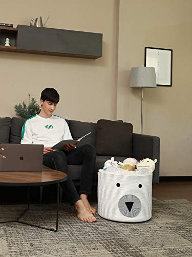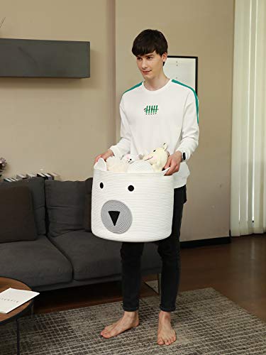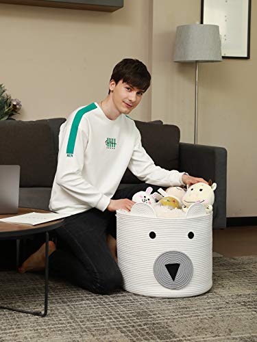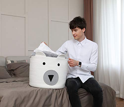 Bear Basket, Animal Basket, Large Cotton Rope Basket, Large Storage Basket, Woven Laundry Hamper, Toy Storage Bin, for Kids Toys Clothes in Bedroom, Baby Nursery, White 18″x15″