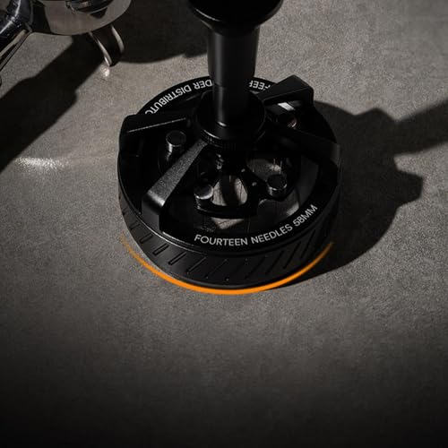 Stainless Steel Pin‘:Espresso Distribution Toolwith 14 fine 0.25MM thick pins made from 304 stainless steel, arranged in concentric circles,efficiently break up and ensure even, powder distribution during rotation