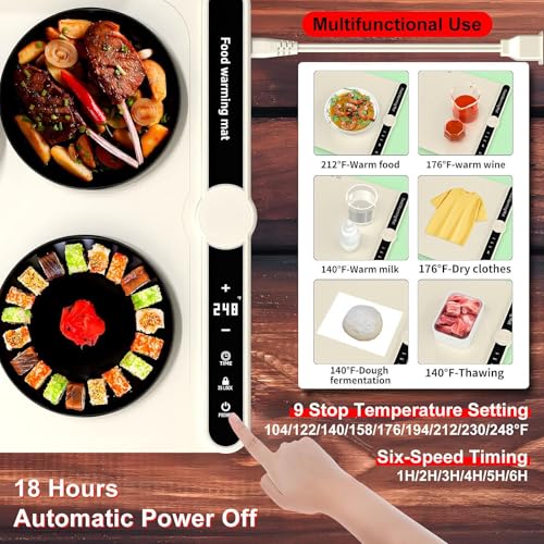 Temperature Control‘: The food heating pad offers nine adjustable temperature settings ranging from 40°C to 120°C, allowing you to keep your food at the great serving temperature
