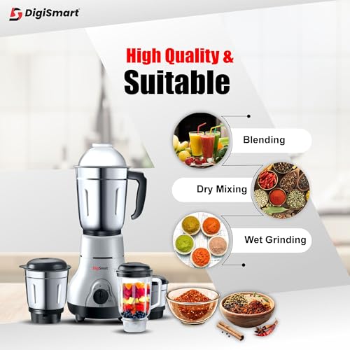 DigiSmart Kitchen Mate 750 Watt Powerful Motor Mixer Grinder for Chutney, Juice and Shake With 4 Jars, Fast Grinding Wet & Dry Ingridients, Stainless Blade, 2 Years Warranty – Grey and Black