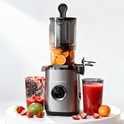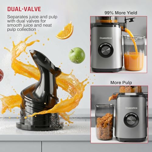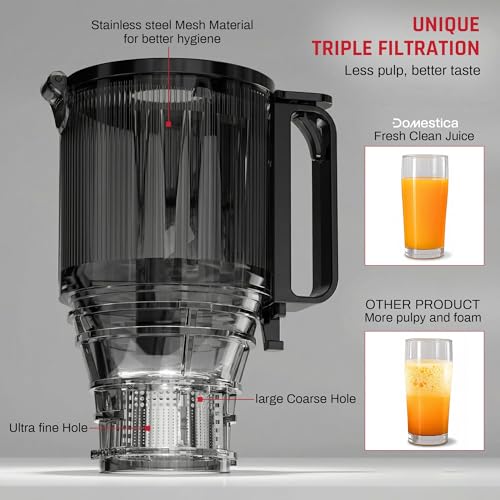 DOMESTICA Dripdrop Cold Press Juicer for Home with 108mm Wide Feed Chute | Slow Juicer Machine for Fruit, Veggie & Nut Milks | Smart Reversal Technology & Triple Strainers For High Nutrition
