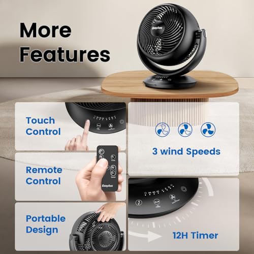 EasyAcc Fan for Bedroom,3D Oscillating Desk Air Circulator Fan for Whole Room,35db Low Noise, Quiet, 3 Speeds,12H Timer with Remote,2025 New Table Fan for Office, Kitchen, Home