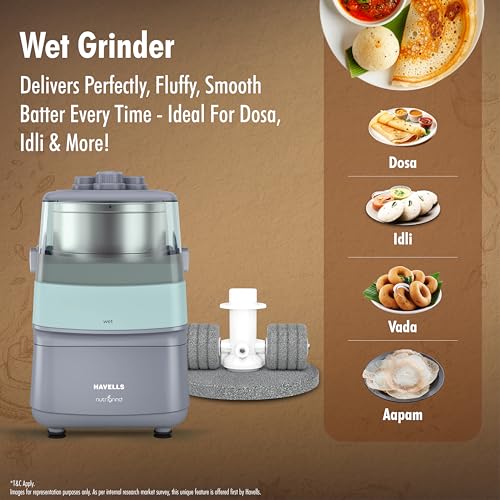 Havells Nutri Grind 3 in 1 Wet & Dry Grinder with 400W High Torque Induction Motor | 1400 RPM Slow Speed Grinding | Quality Coarse Stones | 2 Yr Manufacturer Warranty| Stainless Steel