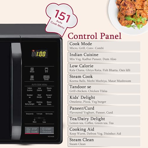 Number of Programs & Panel Information: Micro, Grill, Conv., Combi. | Indian Cuisine, Low Calorie, Steam Cook, Tandoor se, Kids Delight, Paneer/Curd, Tea/Dairy Delight, Cooking Aid, Steam Clean, +More/-Less – Used to increase/decrease the cooking time, STOP/CLEAR (ENERGY SAVING) – Used to stop oven and clear all entries. For setting energy saving feature, START/+30 seconds – The +30 seconds feature allow you to set 30 seconds intervals of HIGH power cooking with a single touch