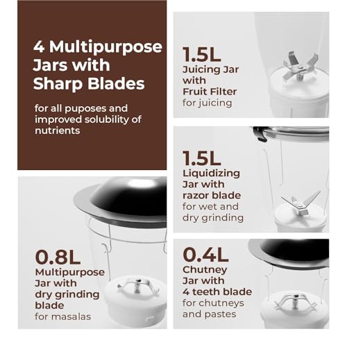 Four Versatile Jars for Various Needs – Comes with three different stainless-steel jars designed for multiple kitchen tasks. The liquidizing jar is ideal for juices and shakes, the wet grinding jar is perfect for batters and purees, and the chutney jar ensures smooth blending of spices and herbs for authentic Flavors.
