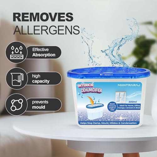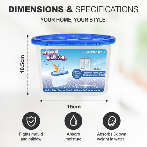 MANTRARAJ 500ML INTERIOR DEHUMIDIFIERS PACK OF 12 : Interior Dehumidifier is designed to remove dampness & humidity from the air in your home. disposable dehumidifier Helps stop damp, mould, mildew and condensation. They work fantastic in keeping your items and fabrics from distractive effects of mould and moisture keeping them dry with the mantraraj disposable interior dehumidifier. Protects clothes and items from excess moisture damage.