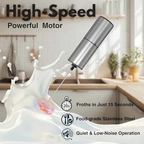 【Powerful Handheld Electric Milk Frother】 The steel milk frother is equipped with a strong motor powered by AA batteries (not included), designed for durability and a sleek, modern look. With a simple one-button operation, it froths milk and mixes drinks with impressive efficiency, making it a reliable tool in your kitchen.