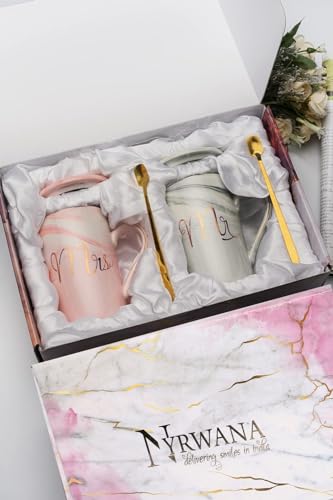 NYRWANA Coffee Mug, Marriage Gifts for Wedding, Wedding Present for Couples, Couple Present, Diwali Gift, Mr & Mrs Set of 2 Coffee Mugs, Lids, Golden Spoon and Beautiful Gift Box (380ml-Ceramic)