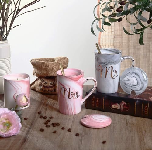 PREMIUM QUALITY: Made of high-quality ceramic, Mr and Mrs Coffee Mugs with Lid and Spoon are lead and cadmium-free and safe. The surface is smooth and very easy to clean. Fired at a high temperature, the ceramic marble coffee mug set can be used in the dishwasher, microwave, refrigerator, and oven.