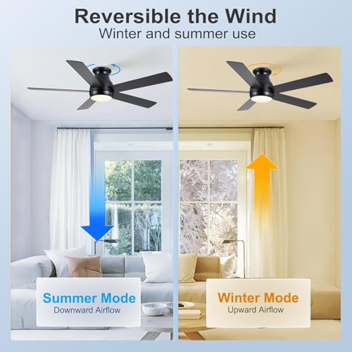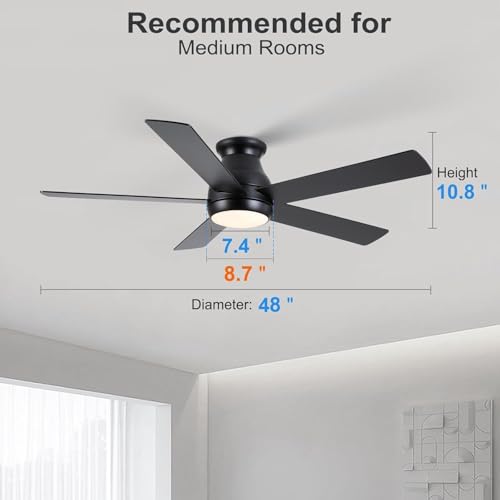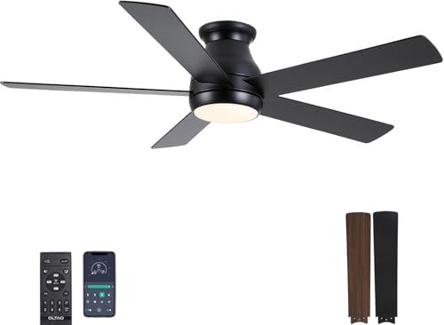 Elegant Design: The OLTAO Fortis flush mount 48 inch Ceiling Fan, with its matte black finish and reversible dual-tone blades (black and walnut wood grain), adds a touch of modern minimalism to any space. Crafted with durable, thickened wood, its 48-inch flush mount design ensures a solid, practical fit. The fan includes a replaceable, dimmable LED light with an acrylic cover, delivering soft, energy-efficient illumination.