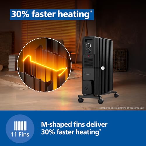 PHILIPS 11 Fin Oil Filled Room Heater (OFR) | M-Shaped fins for faster, uniform heating | Two Knob Controls for temperature & heat modes | Tilt & Auto Shut-Off Safety | PTC Fan Heater for quick warmth