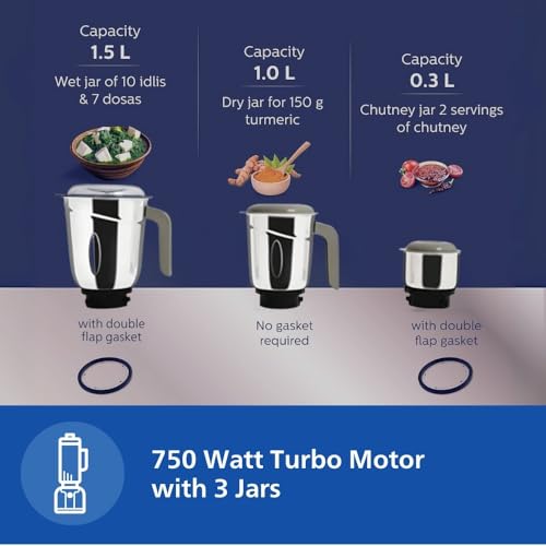 No of Jars: 3; Jar Size: Wet Jar (1.5 Litres), Multipurpose Jar (1 Litre), Chutney Jar (0.3 Litres); Jar Material: Stainless Steel; Body Material: ABS; Blade Material: Stainless Steel; Speed Control: 3 Speed Control + Pulse