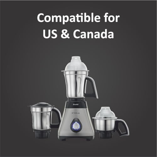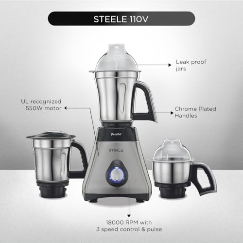 Preethi Steele 110V Mixer Grinder for Kitchen | 3 Jar, 550W Mixie| Perfect for Grinding | Silver/Black (MG 206) – Only use in USA & Canada