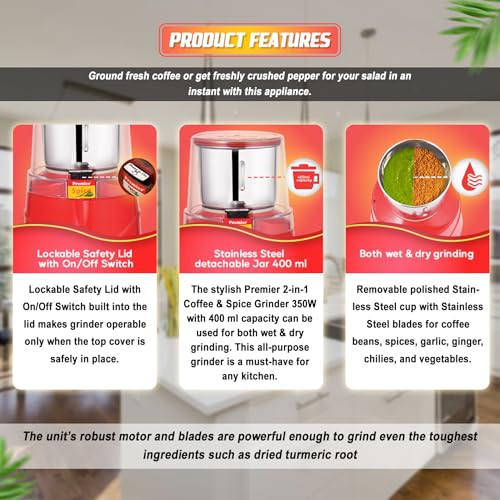 Premier Spice Grinder | 350W Wet & Dry Multifunction Food Grinder | Stainless Steel Herbs, Spices, Nuts, and Coffee Grinder for Home & Office with Detachable Jar