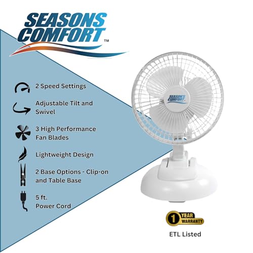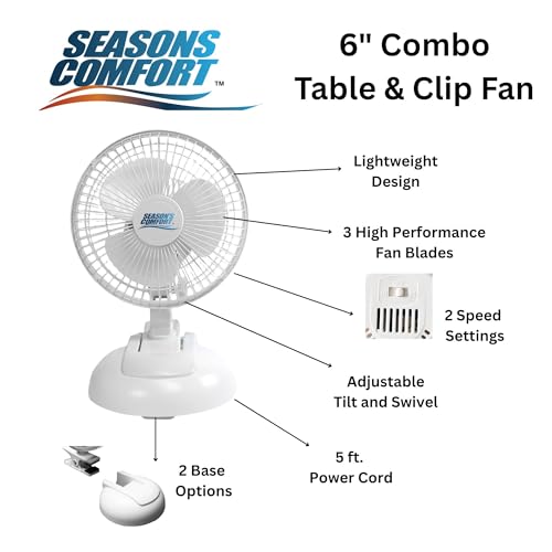 Seasons Comfort Personal Clip Or Desk Fan With Removable Base, Portable, Mini Bedroom Fan, 6 Inch, 2 Speed, Strong Clamp – Ideal for Home, Bedroom, Dorm & Office