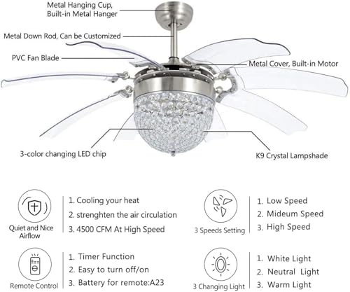 Elegant 42-Inch Chandelier Fan: Features a modern chrome silver finish with 8 retractable ABS blades that open and close seamlessly for a stylish, space-saving design.