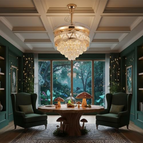 The Crafted Gesture 42-Inch French Gold K9 Crystal Retractable Ceiling Fan|Metal Body, 3-Colour Tricolour LED (Warm/White/Natural)|Modern Fan for Kitchen, Dining, Cafes, Hotels & Bars|Bermuda Triangle