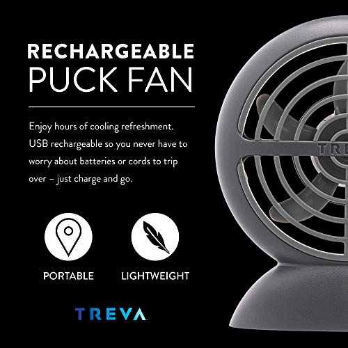 RECHARGEABLE SMALL FAN – This puck-shaped small fan from Treva is fully rechargeable battery powered, no batteries required! Easily charge it with the included micro USB charging cable. Light flashes while charging. Once charge is complete, light stops flashing.
