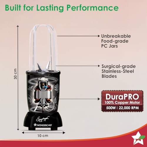 Wonderchef Nutri-blend 500W Mixer Grinder, 22000 RPM Motor, Smoothie Maker, Masala Grinder, Chutney Blender, 3 Unbreakable Jars, Recipe Book by Chef Sanjeev Kapoor, 2 Yr Warranty, Black